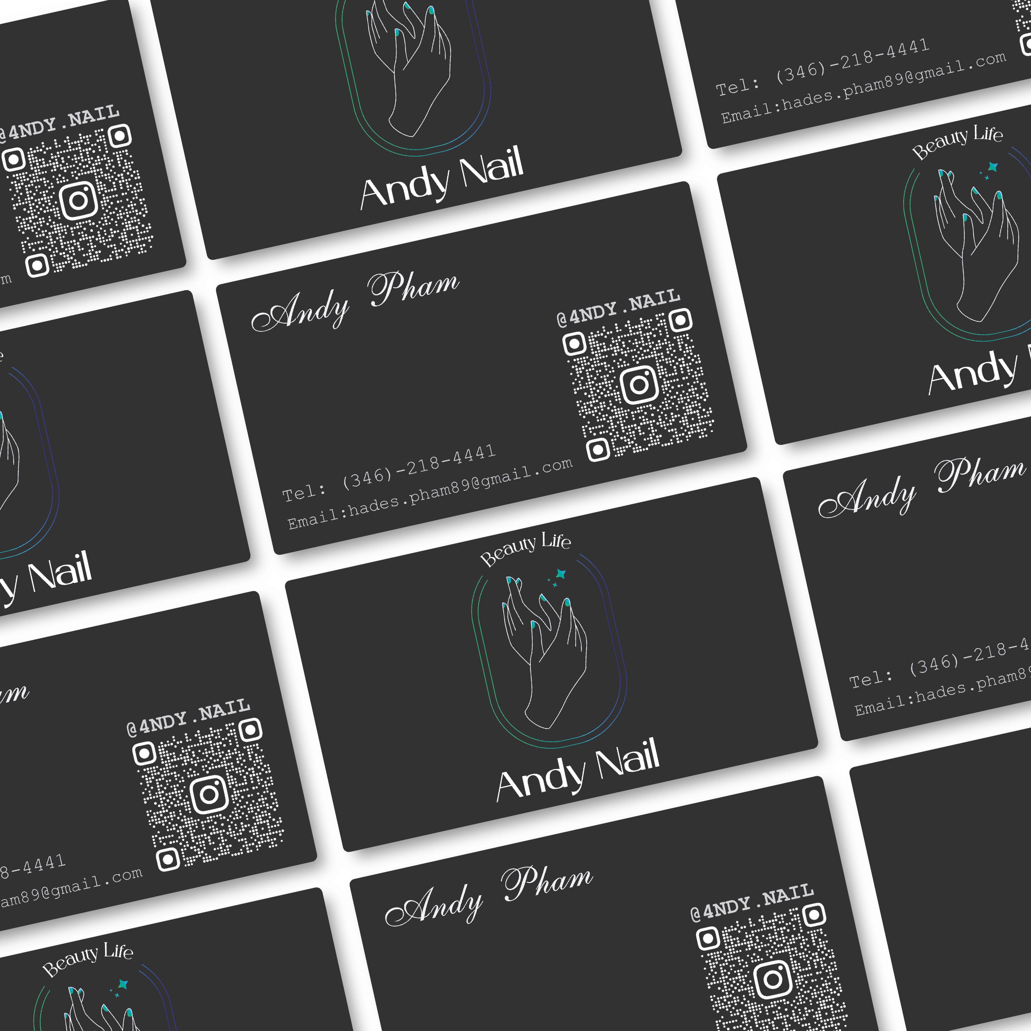 The "Andy Nail" business card project combines minimalism with sophisticated beauty, reflecting the brand’s refined approach to nail art. With a sleek black background, the design uses gradient detail elements to subtly evoke depth and elegance, offering a modern yet timeless aesthetic. The card’s clean, bold typography complements the minimal layout, ensuring a professional and eye-catching look. Crafted with attention to every detail, these cards serve as a stylish representation of Andy Nail's commitment to high-quality artistry and design.