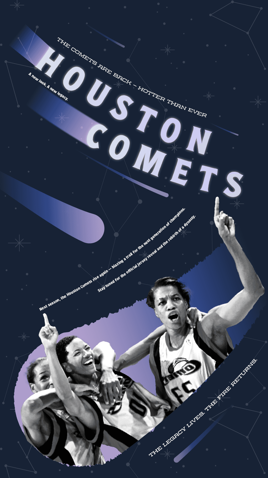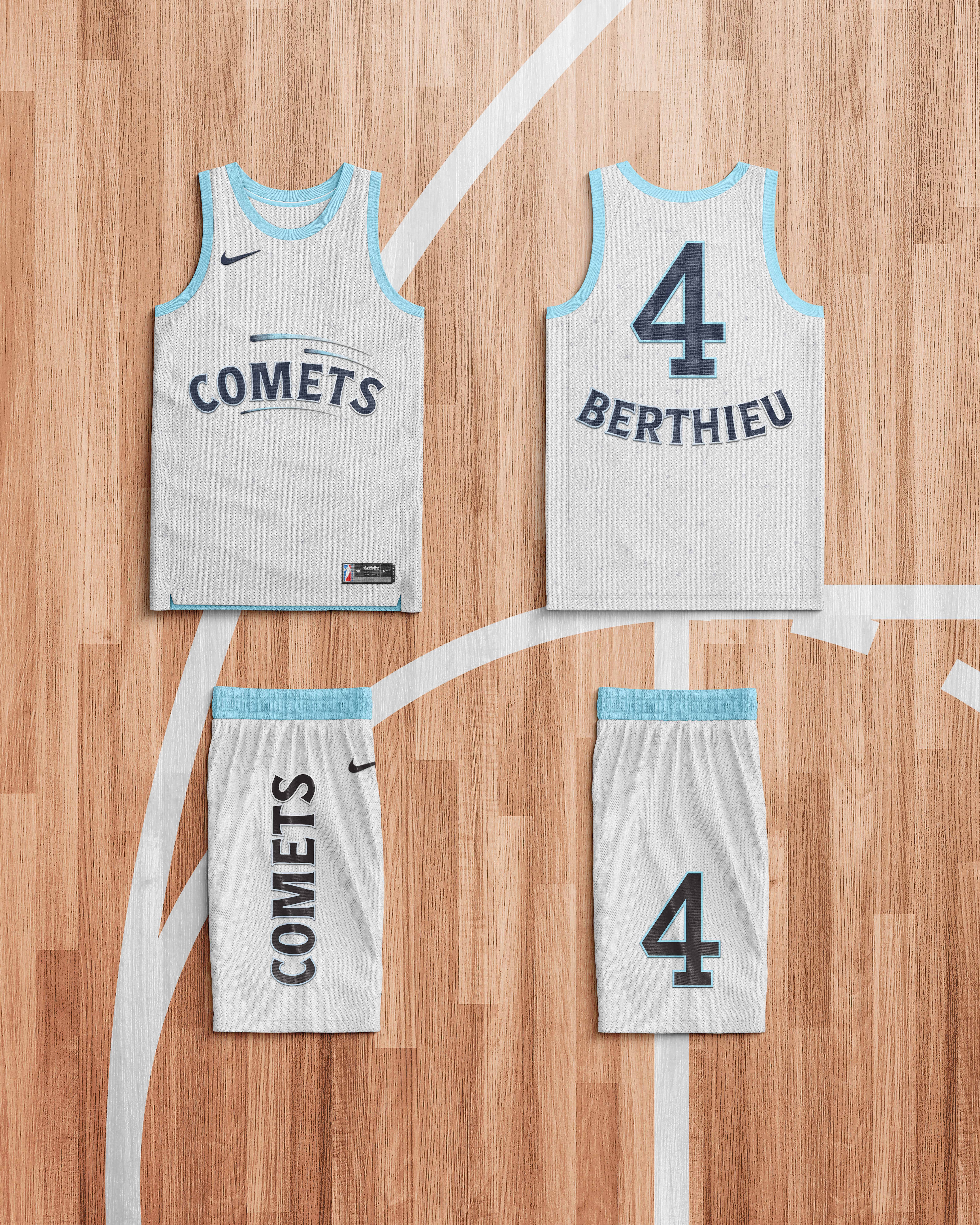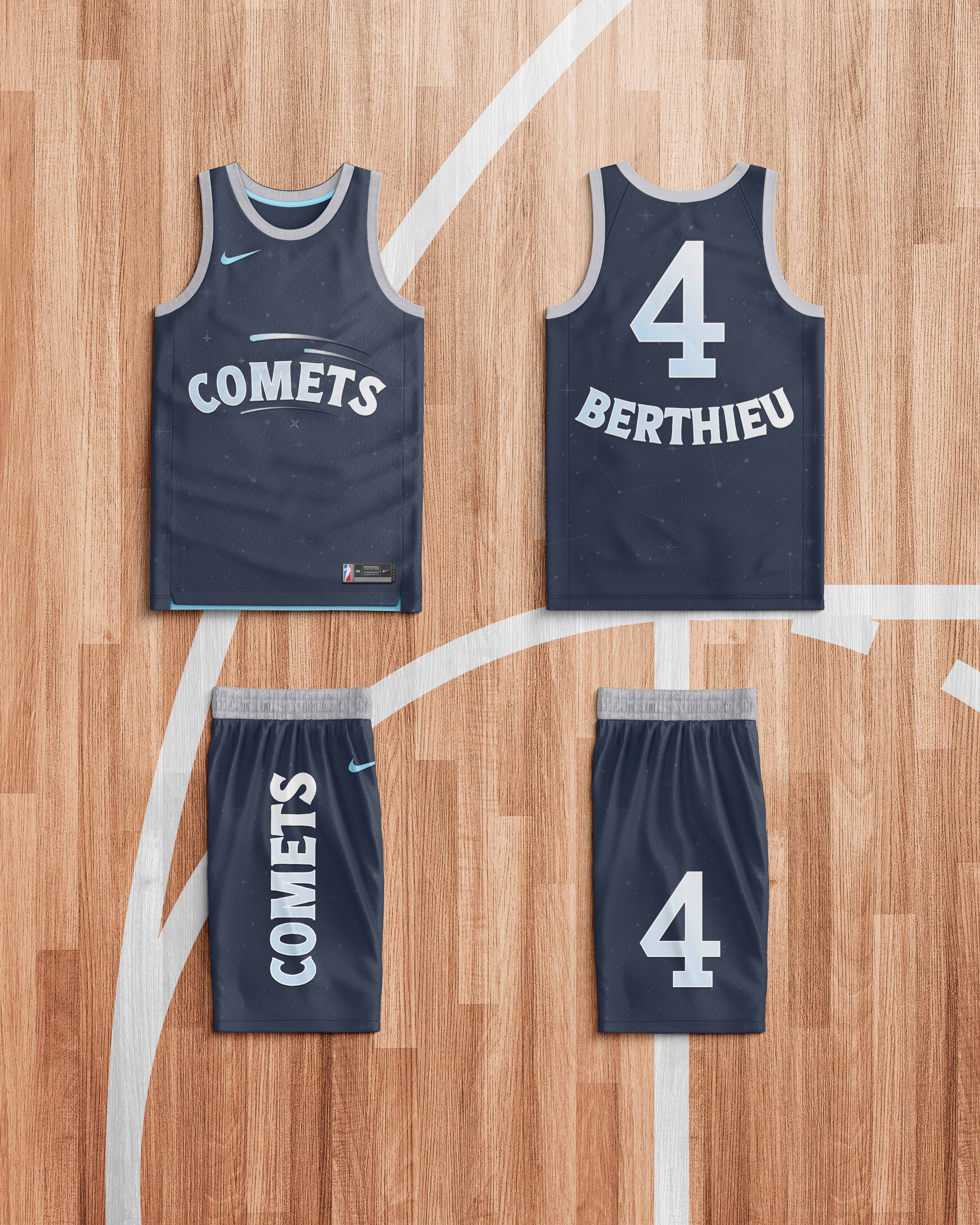 The rebrand is inspired by the Houston constellation, symbolizing guidance, strength, and brilliance. The new logo simplifies the identity to the word “Comets,” enhanced with gradient, stylized comet details to create depth and motion. The home jersey features a deep blue palette to emphasize the idea of the team as stars—bold, elegant, and shining as they approach—while the away jersey uses a softer, brighter base contrasted with dark lettering to convey strength, confidence, and victory. In addition to the logo and home and away jerseys, I designed supporting merchandise, as well as a still poster and a motion poster to announce the team’s rebranding and symbolic comeback. Together, the project celebrates the Comets’ legacy while positioning them as timeless, powerful, and ready to shine again.